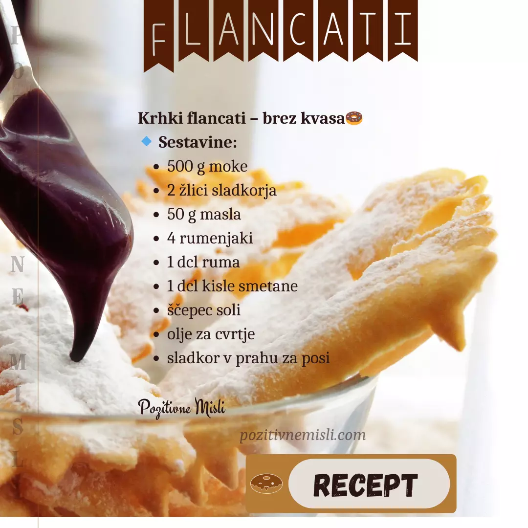 Krhki flancati so popolna pustna sladica, ki vas bo navdušila s svojo preprostostjo in hrustljavostjo. Njihova priprava ne zahteva kvasa, zato jih lahko pripravite hitro in brez dolgega čakanja. Preizkusite ta preprost recept in uživajte v sladkem okusu pustnih dni! 🎭